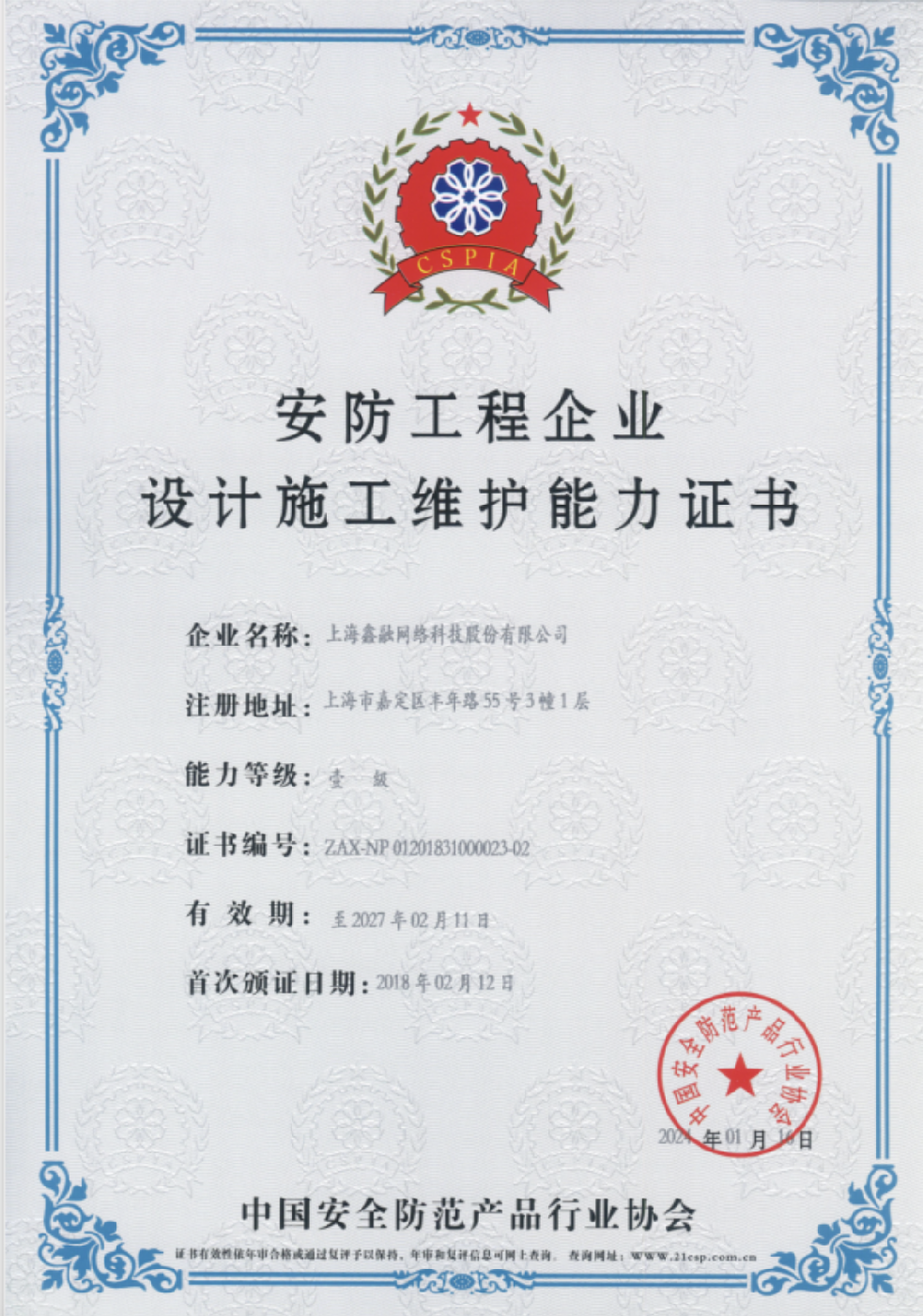 近日,鑫融網絡再次成功通過了中國安全防范產品行業(yè)協會的資質審核,順利續(xù)期安防工程企業(yè)設計施工維護能力一級證書!安防工程企業(yè)設計施工維護能力一級證書是中國安全防范產品行業(yè)協會對安防企業(yè)綜合實力的高度認可。該證書的獲得要求企業(yè)在安防工程的設計、施工和維護方面具備高度的專業(yè)性和豐富的經驗,同時需通過嚴格的