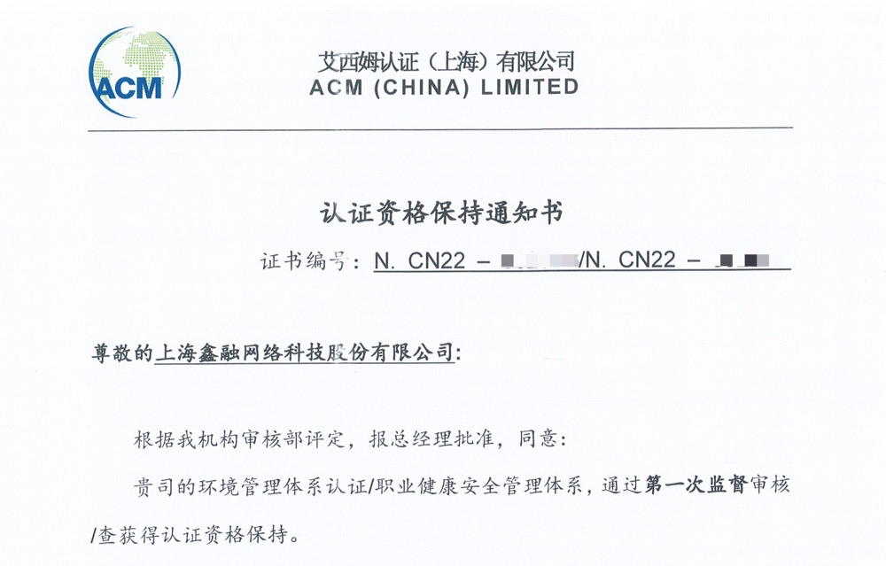 近日,鑫融網(wǎng)絡(luò)在環(huán)境保護(hù)和員工健康安全方面再次獲得行業(yè)認(rèn)可。環(huán)境管理體系認(rèn)證和職業(yè)健康安全管理體系認(rèn)證是衡量一個(gè)企業(yè)在環(huán)境保護(hù)和員工健康安全方面表現(xiàn)的重要標(biāo)準(zhǔn)。艾希姆認(rèn)證(上海)有限公司對(duì)鑫融公司的環(huán)境管理體系和職業(yè)健康安全管理體系進(jìn)行了現(xiàn)場監(jiān)督審核,并確認(rèn)其順利通過審查,繼續(xù)保持認(rèn)證資格。鑫融網(wǎng)絡(luò)