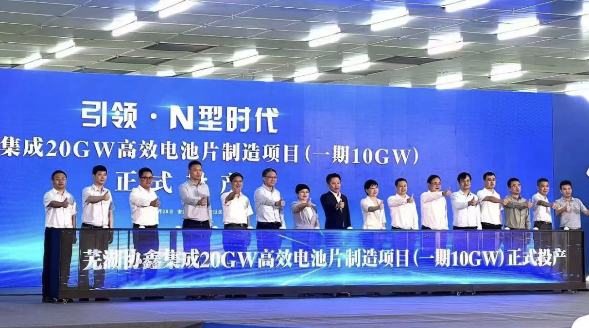 7月28日上午,隨著首塊電池片成功下線,協(xié)鑫集成蕪湖基地20GW高效N型TOPcon電池片制造項(xiàng)目(一期10GW)正式投產(chǎn)。協(xié)鑫集成在N型賽道的快速發(fā)展新添強(qiáng)勁動力,蕪湖電池項(xiàng)目將為合肥、阜寧組件大基地提供高效電池產(chǎn)能配套。灣沚區(qū)委書記殷瓊,協(xié)鑫集團(tuán)副董事長、總裁,協(xié)鑫集成董事長朱鈺峰等參加投產(chǎn)儀式?!皟H用5個(gè)月時(shí)間就